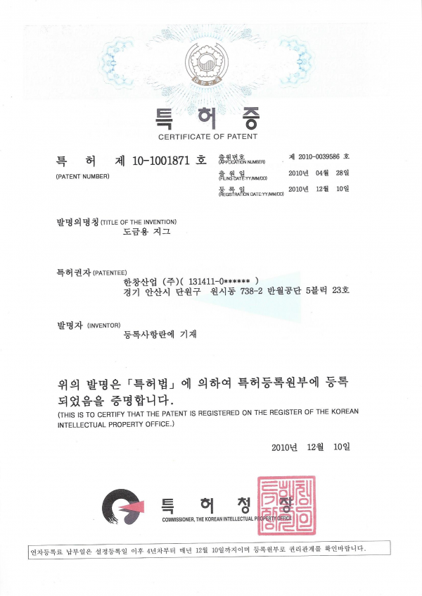 특허증(도금용 지그) 페이지 정보 작성자 관리자 댓글 0건 조회 1,052회 작성일 20-08-21 12:25 본문 . 첨부파일 특허증도금용지그.pdf (154.3K) 47회 다운로드 | DATE : 2023-12-22 11:58:53 목록 이전글ISO14001 환경경영시스템 인증(한글,영문) 20.08.21 다음글지그 디자인등록증(경완철) 20.08.21