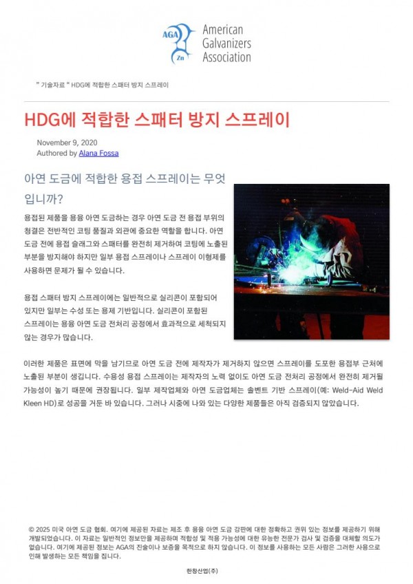 - HDG에 적합한 스패터 방지 스프레이 Anti-Spatter Sprays Suitable for… _ American Galvanizers Association.pdf (179.7K) 249회 다운로드 | DATE : 2025-04-01 10:53:11